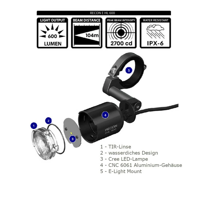 Die Giant Recon EHL 600 wurde speziell für den Einsatz an verschiedenen E-Bike Motorsystemen entwickelt und passt auf die meisten handelsüblichen Motoren wie z.B. von Bosch, Yamaha oder Shimano. Eine optimierte Optische TIR-Linse mit Hochleistungs-LED aus dem Hause CREE sorgen für eine hohe und zuverlässige Lichtleistung bis zu 600 Lumen.